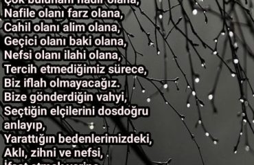 Yolunu yolumuz, kitabını ilmimiz, Peygamberlerini önderimiz, nefislerimizi rızana uygun eğitmişler olarak sana gelip, senden hayatı boyunca hoşnut olup, seni mahşerde hoşnut etmiş ve senin hoşnut edeceğin şehidler arasında dirilmemizi, kelamını dinleyip, cemalini görüp, bizim bilmemizin mümkün olmadığı tüm lütuflarını senden diliyoruz.