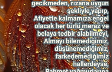 Er Raşid, El Hadi ve El Mü’min olan Rabbim bize indirdiğin hükümleri elbette zorluk çekelim diye indirmedin. Bizi imanımızı kemale erdirme de muvaffak kıl. Bizi kitabını gereği gibi okuyup, sana gereği gibi kul olan ‘has kullarının’ arasına kat! Şeytanın, şeytanlaşmış insanların, nefsimizin, asrın tuzaklarının, dünyevi dertlerimizin esaretinden kurtulmuş ve seni hoşnut etmiş bir ömrün sonunda, ‘şehid’ olarak sana kavuştur.