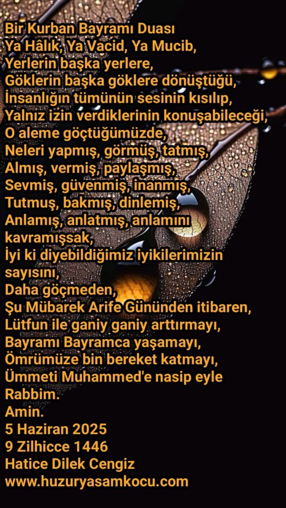 Bir Kurban Bayramı DuasıYa Hâlık, Ya Vacid, Ya Mucib,Yerlerin başka yerlere, Göklerin başka göklere dönüştüğü,İnsanlığın tümünün sesinin kısılıp,Yalnız izin verdiklerinin konuşabileceği,O aleme göçtüğümüzde,Neleri yapmış, görmüş, tatmış,Almış, vermiş, paylaşmış,Sevmiş, güvenmiş, inanmış,Tutmuş, bakmış, dinlemiş,Anlamış, anlatmış, anlamını kavramışsak,İyi ki diyebildiğimiz iyikilerimizin sayısını,Daha göçmeden,Şu Mübarek Arife Gününden itibaren, Lütfun ile ganiy ganiy arttırmayı,Bayramı Bayramca yaşamayı,Ömrümüze bin bereket katmayı,Ümmeti Muhammed’e nasip eyle Rabbim.Amin.5 Haziran 20259 Zilhicce 1446Hatice Dilek Cengiz www.huzuryasamkocu.com