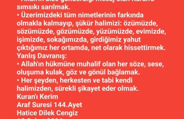 303- Denizlerde tonlarca ağırlıktaki gemilerin yüzüyor olmasının bile Allah’ın varlığının delili olduğunun farkındadır. Sabrı ve şükrü kuşanmak isteyenlerin ibret alacak çok şey bulabileceğinin bilinci ile nankörlüğün her türünden ve nankörlerden uzaklaşır. Sıradan insanların her başları sıkıştığında dini tamamen Allah’a has kılarak O’na yalvardıklarını, Allah onları selamete eriştirincede yüz çevirip tekrar müşrikçe yaşamaya devam ettiklerini görür. Ancak kurtulanlardan az bir kısmının orta yolu tutarak Rablerinin rızasına uygun yaşadıklarını gözlemler. İnkar edenlerinse, bile bile inkar edip, hainlikten vazgeçmediklerinin şuurundadır.