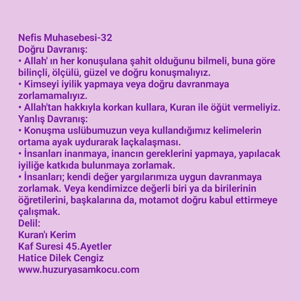 - Allah’ ın her konuşulana şahit olduğunu bilmeli, buna göre bilinçli, ölçülü, güzel ve doğru konuşmalıyız.